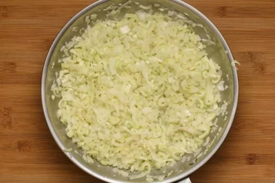 • Heat oil in a skillet and sauté (stir-fry) diced onion, celery and salt until glassy / translucent look, about 5 minutes.